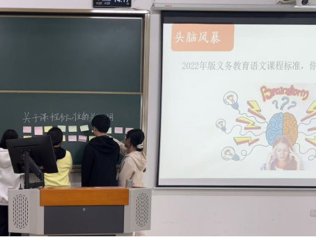 随后,钟正美老师组织同学们围绕2022年版义务教育语文课程标准的关键词展开讨论,并用便签写下,贴在黑板上。同学们都踊跃参与,将自己的看法粘贴在黑板上。同学们粘贴完便签后钟老师便揭晓了关键词,并进行了详细地讲解。